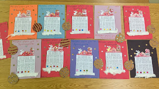 .. φτιάξαμε με τα παιδιά και ένα ατομικό ημερολόγιο αντίστροφης μέτρησης αντίστοιχου ύφους για να το πάρουμε μαζί μας στο σπίτι. Από το βιβλίο της αγαπημένης φίλης και συναδέλφου Αριάδνης Ευαγγελοπούλου " Τα πρώμα μου βήματα στη γνώση", φωτοτύπησα και έδωσα στα παιδιά μια σελίδα με ένα ημερολόγιο αντίστοφης μέτρησης. Ζωγραφίσαμε, στολίσαμε, βάλαμε βαμβάκι για χιόνι, κολλήσαμε σε χαρτονάκια και έδωσα στα παιδιά αυτοκόλλητα. Κάθε ημέρα πρέπει να κολλάνε ένα αυτοκόλλητο σε ένα κουτάκι με τον αριθμό που έχει το ημερολόγιό μας και έτσι θα μετράμε τις ημέρες μέχρι τα Χριστούγεννα. Αντίστοιχο σημείωμα έφτασε σε μορφή γράμματος και στους γονείς των παιδιών στο σπίτι για να μπορέσουν οι γονείς να συνεργαστούν και να βοηθήσουν τα παιδιά στο σπίτι προκειμένου να ολοκληρωθεί η δραστηριότητα με επιτυχία.